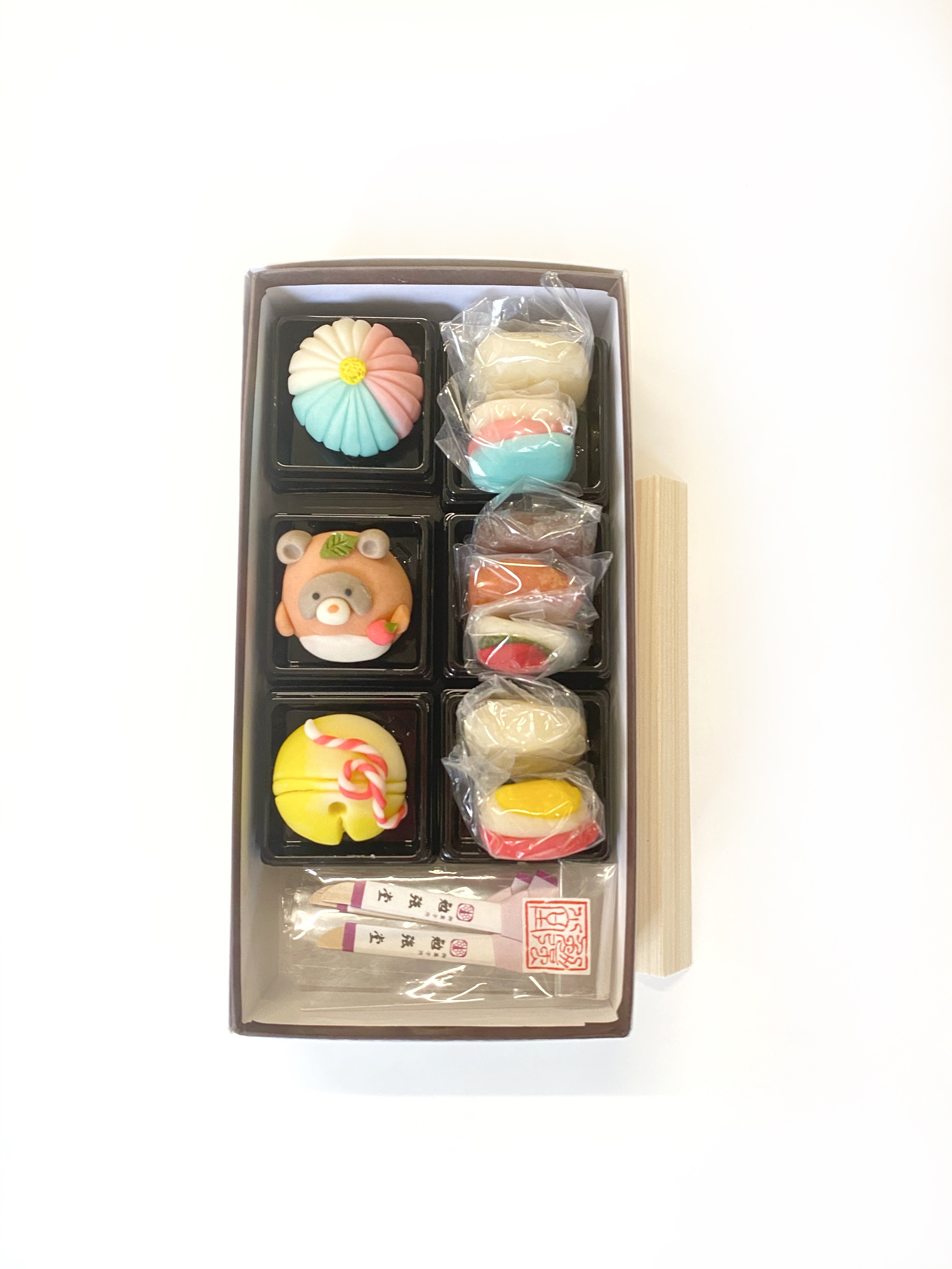冬の訪れを感じる「手毬、たぬき、鈴」の3種をご用意しました。セットにはお菓子製作に使用する、三角ベラ、竹串が揃っているので、これだけで本格的な上生菓子体験ができます。